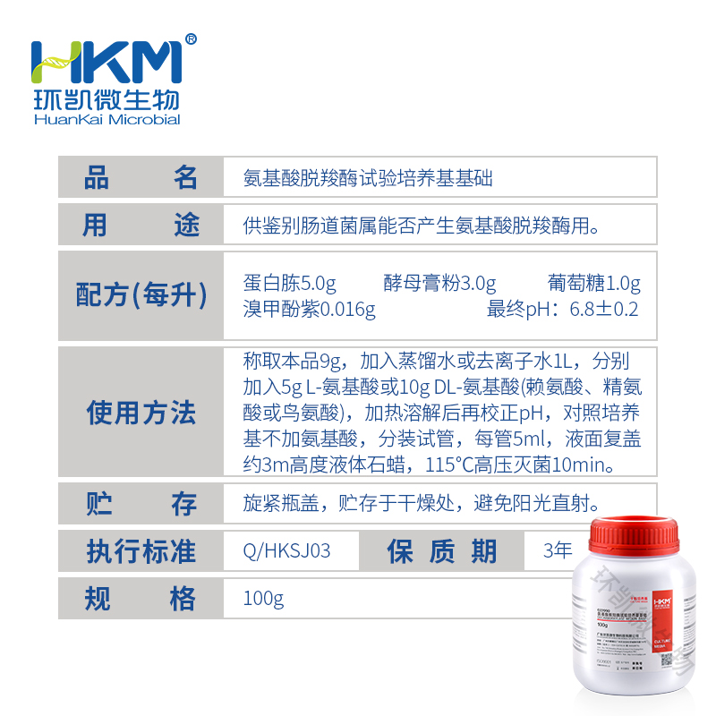 產(chǎn)品用途:供鑒別腸道菌屬能否產(chǎn)生氨基酸脫羧酶用。
