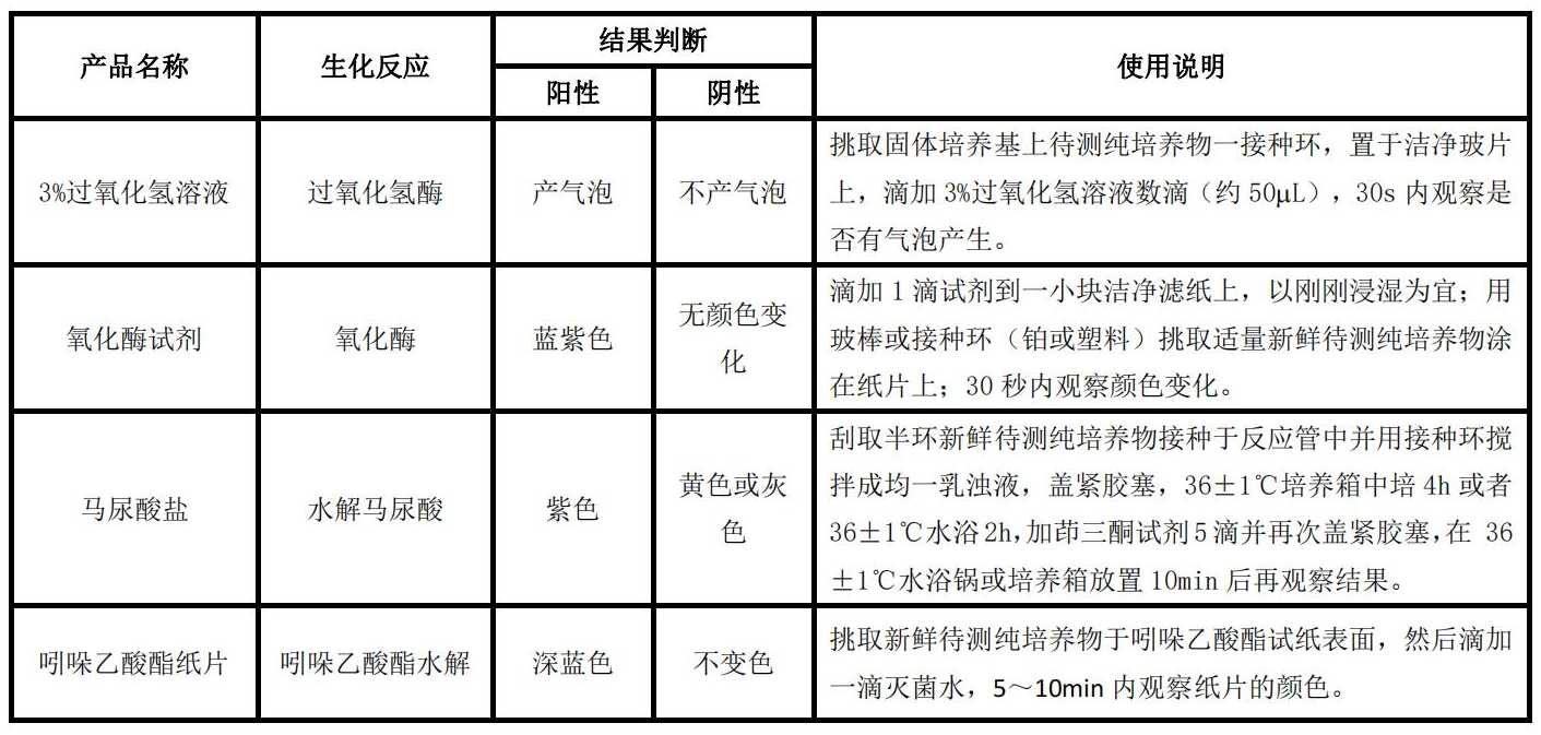 二)組成:3%過氧化氫溶液 2mL×2 瓶、氧化酶試劑 1 瓶、馬尿酸鹽 20 支、吲哚乙酸紙片 20 片、茚三酮試劑 1 瓶、潔凈濾紙條 20 條。