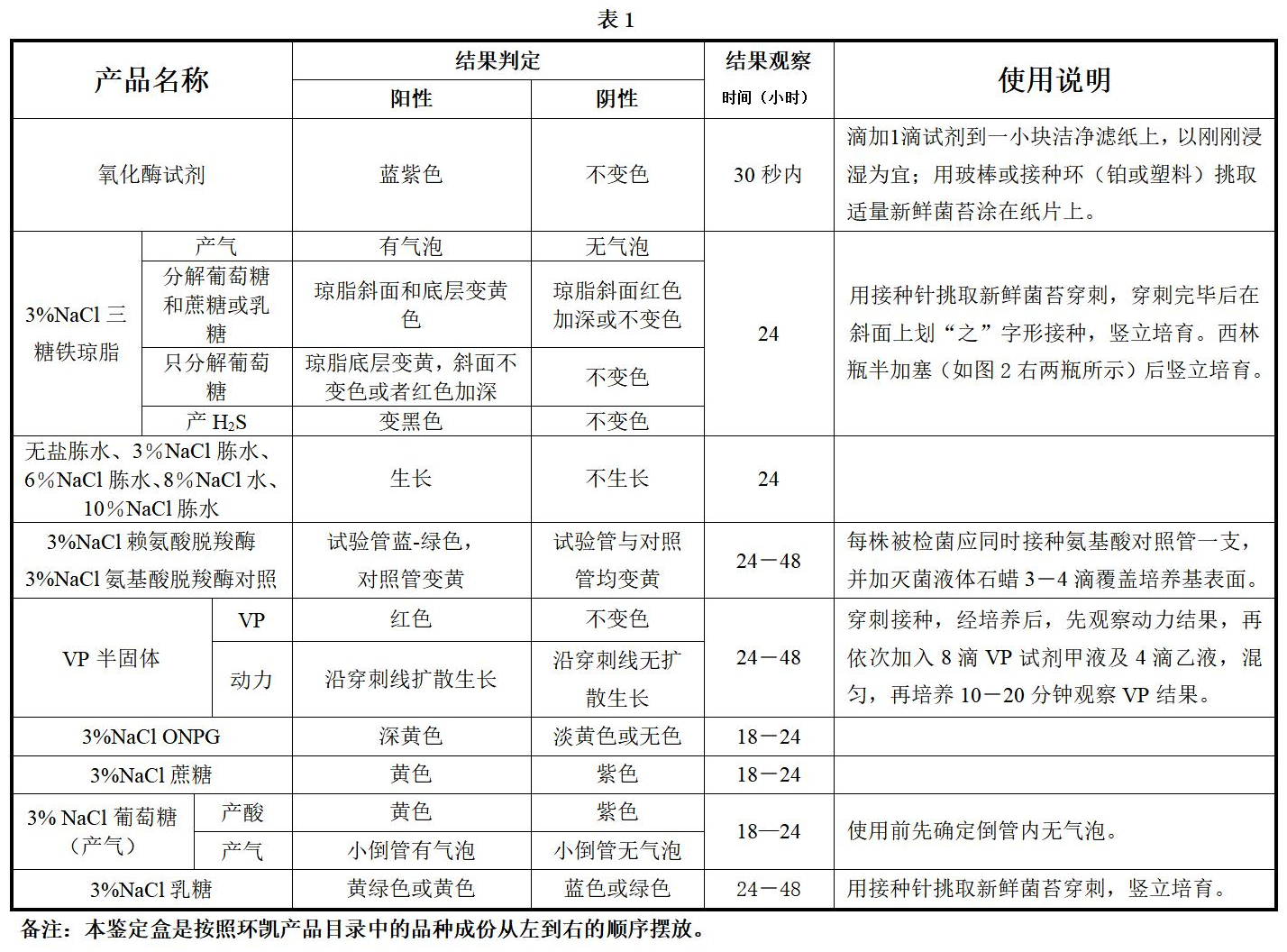 鑒定生化反應(yīng)的14種試劑(表1),含1瓶氧化酶試劑;配套試劑用品:1瓶VP試劑甲液、1瓶VP試劑乙液、1瓶無菌液體石蠟、5瓶0.85%無菌生理鹽水、1瓶0.5 McFarland的濁度管、5支一次性無菌吸管。