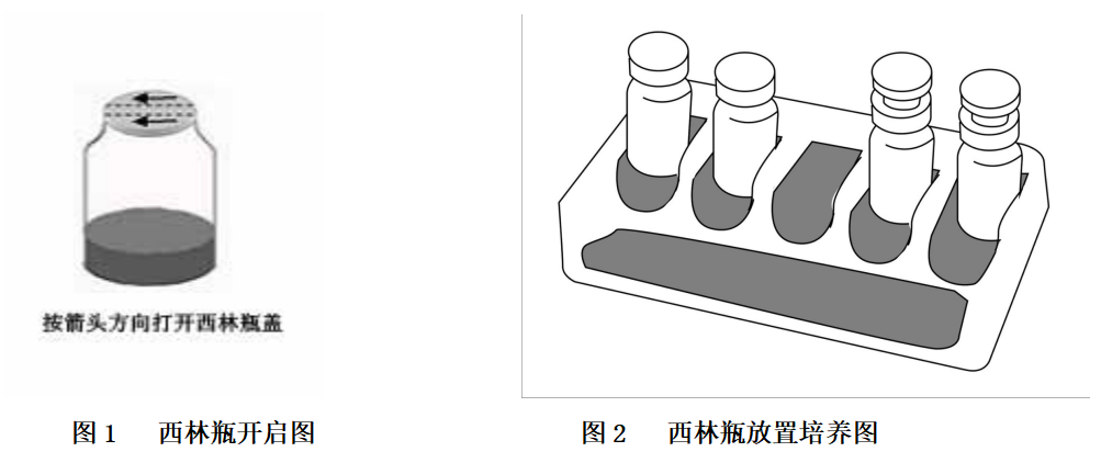 開啟西林瓶前,用75%酒精棉消毒西林瓶表面,在無菌條件下,按鋁蓋上的箭頭方向打開鋁蓋,撕開鋁蓋,打開西林瓶膠塞(如圖1)。所有的西林瓶在使用后均高壓滅菌后方可棄去。