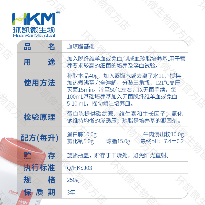 產品用途:加入脫纖維羊血或兔血,制成血瓊脂培養(yǎng)基,用于營養(yǎng)要求較高的細菌的培養(yǎng)及溶血試驗。