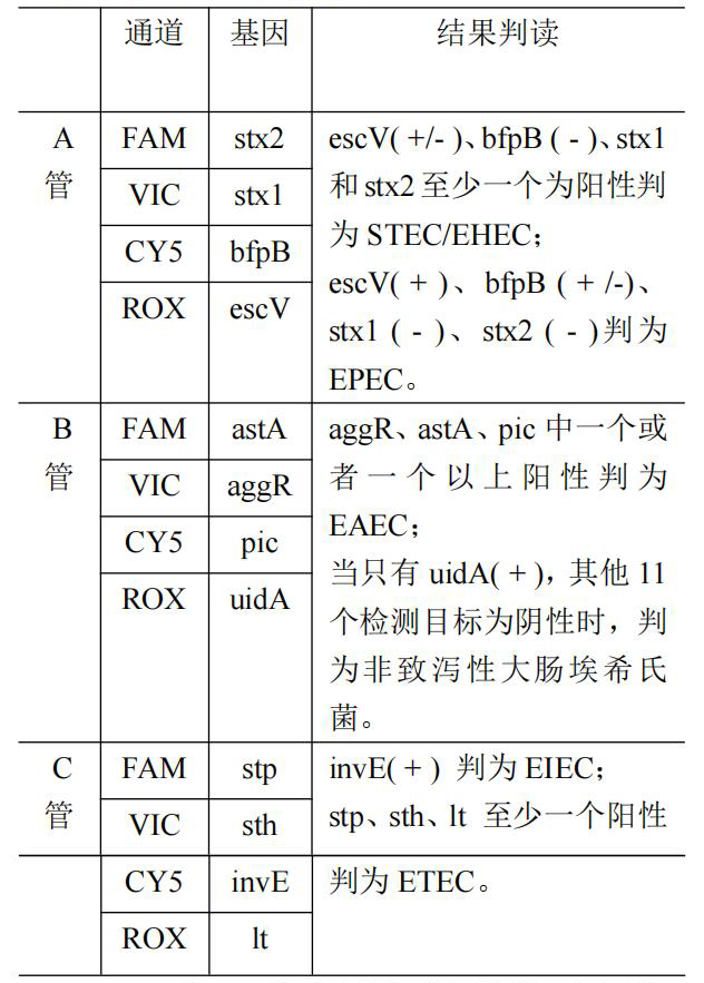 A 管體系可用于 STEC/EHEC、EPEC 檢測(cè),B 管體系可用于 EAEC 檢測(cè)和大腸埃希氏菌種屬鑒定,C 管體系可用于 ETEC、EIEC 檢測(cè)。