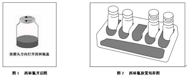 開啟西林瓶前,用75%酒精棉消毒西林瓶表面,在無菌條件下,按鋁蓋上的箭頭方向打開鋁蓋,撕開鋁蓋,打開西林瓶膠塞(如圖1)。所有的西林瓶在使用后均高壓滅菌后方可棄去。