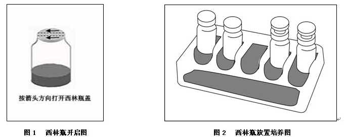開啟西林瓶前,用75%酒精棉消毒西林瓶表面,在無菌條件下,按鋁蓋上的箭頭方向打開鋁蓋,撕開鋁蓋,打開西林瓶膠塞(如圖1)。所有的西林瓶在使用后均高壓滅菌后方可棄去。