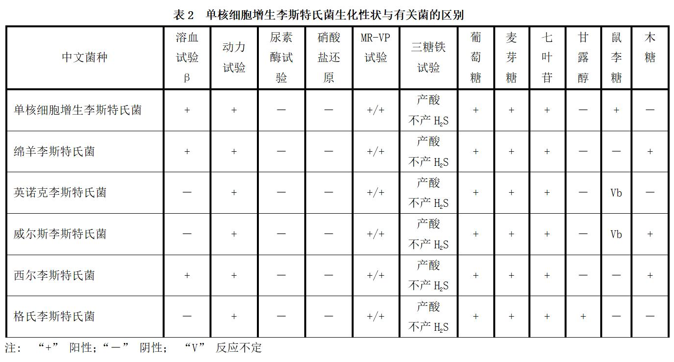 四)單核細(xì)胞增生李斯特氏菌的主要生化特性及有關(guān)菌的區(qū)別見(jiàn)表2。(只供參考)