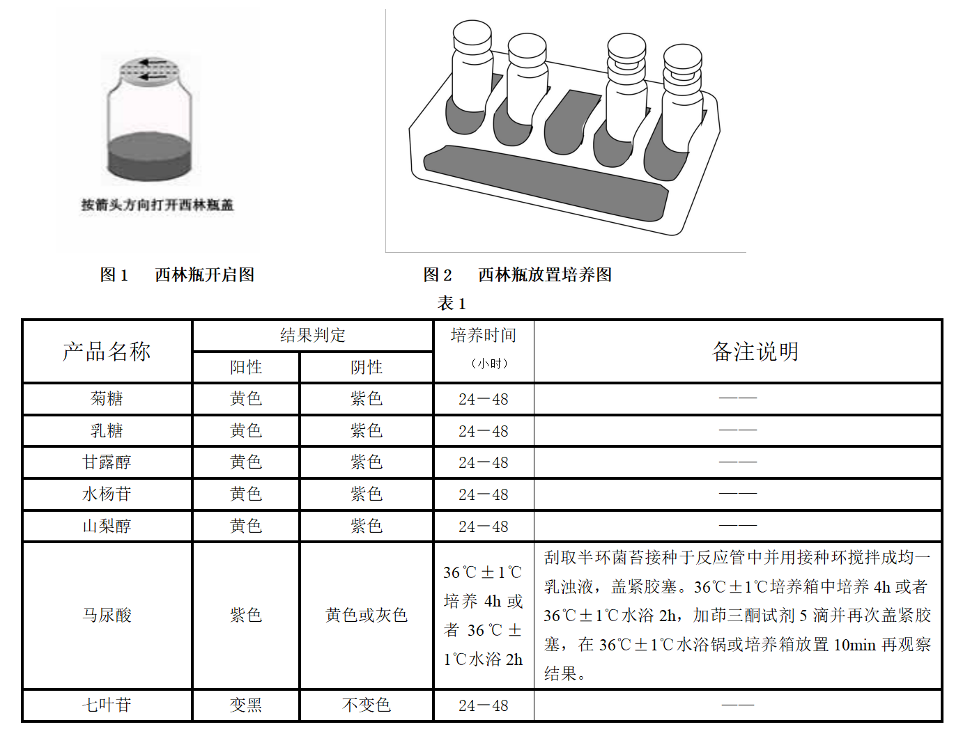 將疑是嗜熱乳酸鏈球菌的新鮮菌苔用0.85%無菌生理鹽水稀釋至2McFarland,各吸取0.05-0.08mL(約1~2滴)的菌懸液加入每種微量西林瓶內。將已接種的西林瓶再套上膠塞,一般采用全加塞(如圖2左兩瓶所示),特殊情況在下表注明采用半加塞(如圖2右兩瓶所示),直立于內托的凹槽內(如圖2),或放置于合適的瓶架中,于35-37℃培養(yǎng)箱中培養(yǎng),結果觀察見表1。