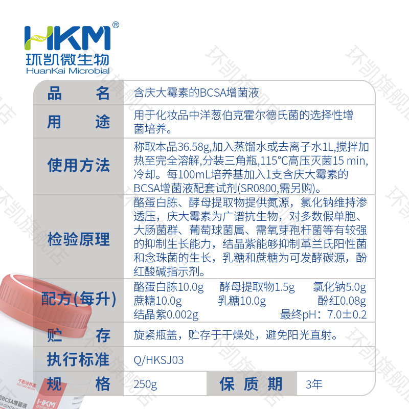 產(chǎn)品用途:用于化妝品中洋蔥伯克霍爾德氏菌的選擇性增菌培養(yǎng)。