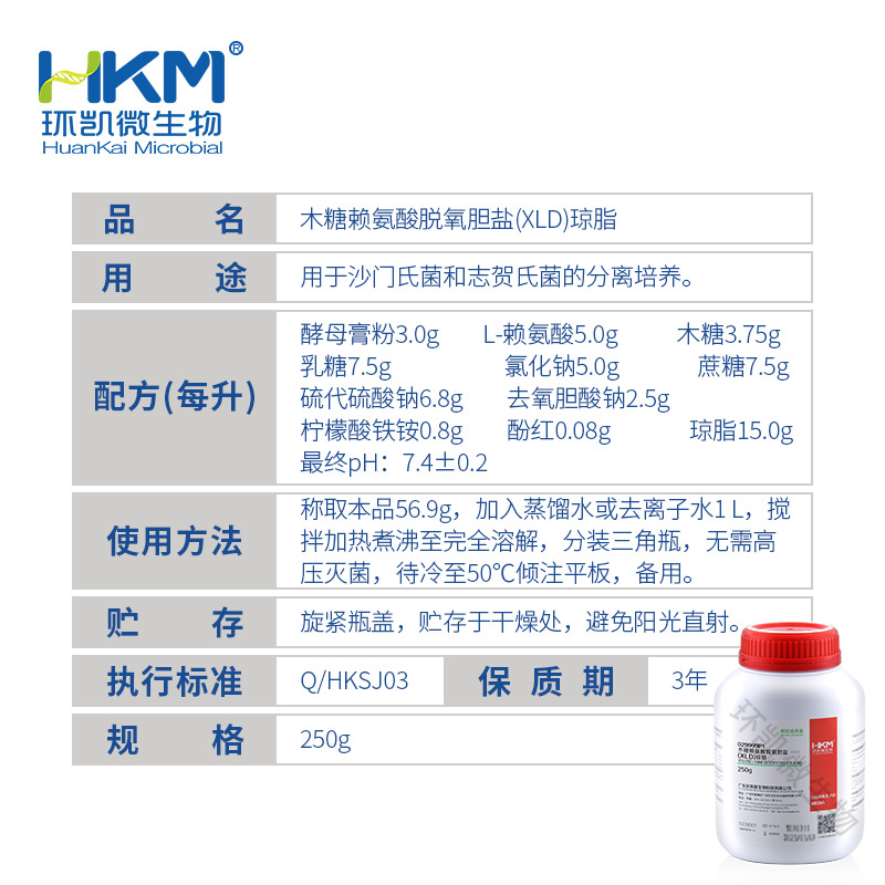 木糖賴氨酸脫氧膽鹽(XLD)瓊脂顆粒配方成分:酵母浸粉3.0g、L-賴氨酸5.0g、木糖3.75 g、乳糖7.5 g、蔗糖7.5g、氯化鈉5.0g、硫代硫酸鈉6.8g、脫氧膽酸鈉2.5 g、檸檬酸鐵銨0.8g、酚紅0.08g、瓊脂15.0g(最終pH7.4±0.2)。