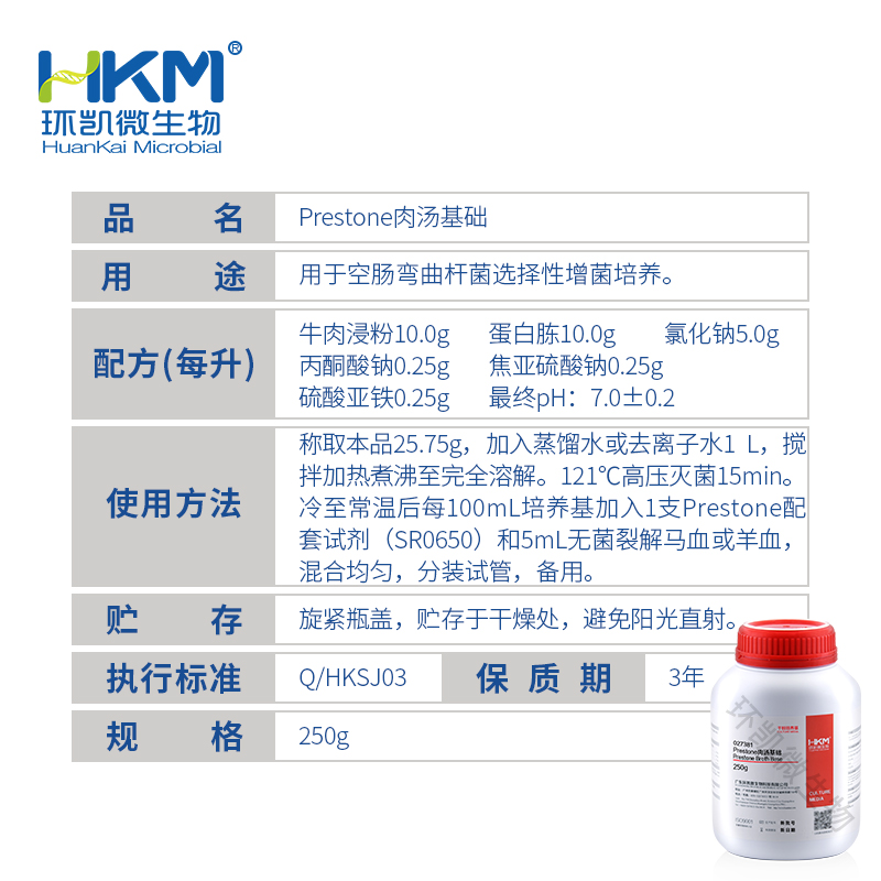 使用方法:稱取本品25.75g,加入蒸餾水或去離子水1 L,攪拌加熱煮沸至完全溶解。121℃高壓滅菌15min。冷至常溫后每100mL培養(yǎng)基加入1支Prestone配套試劑(SR0650)和5mL無菌裂解馬血或羊血,混合均勻,分裝試管,備用。