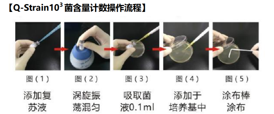 【使用方法】 1.Q-Strain10 3系列 含菌量為 110-1100cfu/瓶 在塑料盒中取出凍干菌粉瓶,往凍干菌粉里添加 1.1mL 復(fù)蘇液,振蕩 5s, 以便充分溶解 并形成均勻的菌懸液,此時每 0.1mL 含菌量為 10-100cfu,參考 Q-Strain 10 3菌含量計數(shù)操 作流程。